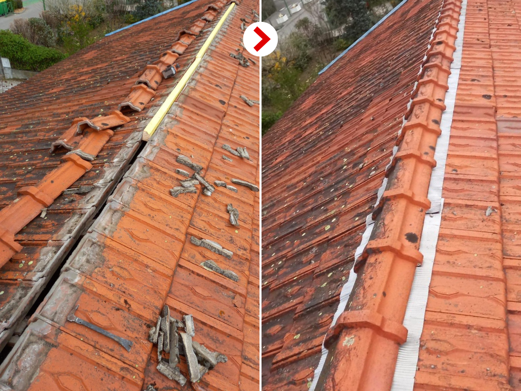 Lors de notre intervention, nous avons constaté que le faîtage était fissuré et que plusieurs tuiles faîtières s’étaient légèrement déplacées. Le mortier était abîmé, ce qui laissait passer l’eau et provoquait une infiltration à l’intérieur.